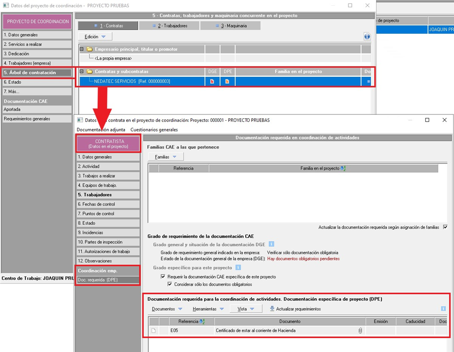 Como hemos comentado en el punto anterior, para indicar que una contrata trabaja para una empresa, hay que crear proyectos en las empresas, e incluir en los mismos a las contratas que participan. La Tanto la documentación general solicitada en el mantenimiento, como la documentación solicitada por la empresa, se tendrá en cuenta en todos los proyectos en los que se incorpore a la contrata, los del mantenimiento se tendrán en cuenta en todas las empresas, mientras que los requerimientos por empresa, se tendrán en cuenta particularmente para el acceso a esa empresa. Ahora bien, es posible que en algún proyecto en particular, se necesite solicitar documentación concreta relacionada con ese proyecto, y el estado de esos documentos sólo se deberá controlar para el acceso a ese proyecto. Si la contrata a su vez, está vinculada a otros proyectos, el estado de esa documentación no afectará al acceso de la contrata en el resto de proyectos con los que esté vinculada.