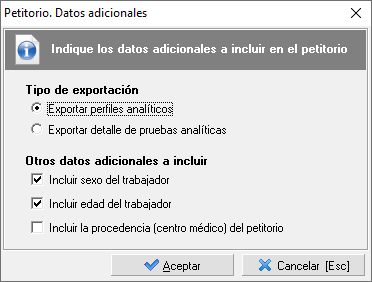 Prevengos les mostrará una pantalla de opciones, donde puede indicar si en el fichero quiere el detalle de los perfiles analíticos asociados a la petición o el detalle de las pruebas analíticas, elegir una opción u otra depende de lo que haya acordado con su laboratorio. Por último tiene que indicar la ubicación del ordenador donde quieren guardar el fichero.