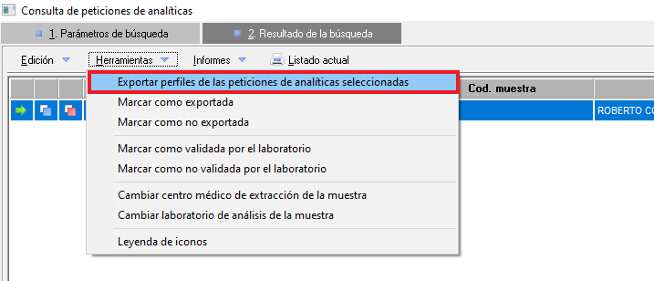 Dentro del buscador debe utilizar los filtros correspondientes para localizar a los trabajadores para los que quieren generar el documento de petición de analíticas. Cuando pulse el botón 'Realizar búsqueda', la aplicación les mostrará el resultado de la consulta, desde donde podrán seleccionar a los trabajadores para los que quieren generar el fichero de petición de analíticas. Una vez seleccionados los trabajadores, desde el menú 'Herramientas' debe pulsar sobre la opción 'Exportar perfiles de las peticiones de analíticas seleccionadas'.