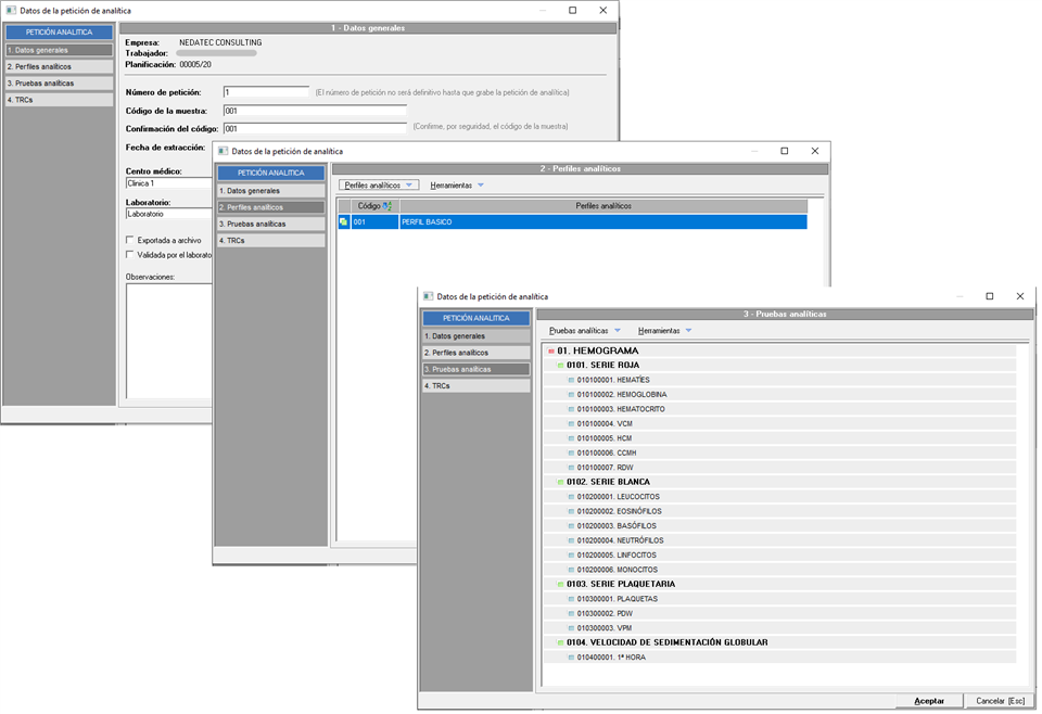 En el punto 2 el usuario puede añadir los perfiles analíticos que quiera que se realicen en esta prueba. Los perfiles analíticos son grupos de pruebas analíticas y TRC'S que han debido definirse previamente en el mantenimiento de perfiles. Al añadir un perfil analítico a la petición, se añadirán al apartado de 'Pruebas analíticas' las pruebas vinculadas a ese perfil y en TRC's los test de reflejos vinculados.