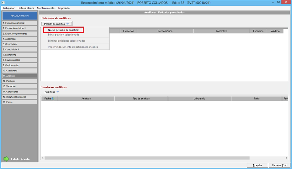 Al abrir las peticiones de analíticas muestra el listado de peticiones asociadas al reconocimiento, y desde aquí puede dar de alta nuevas peticiones o editar/eliminar las ya existentes utilizando el menú desplegable 'Petición de analítica'.