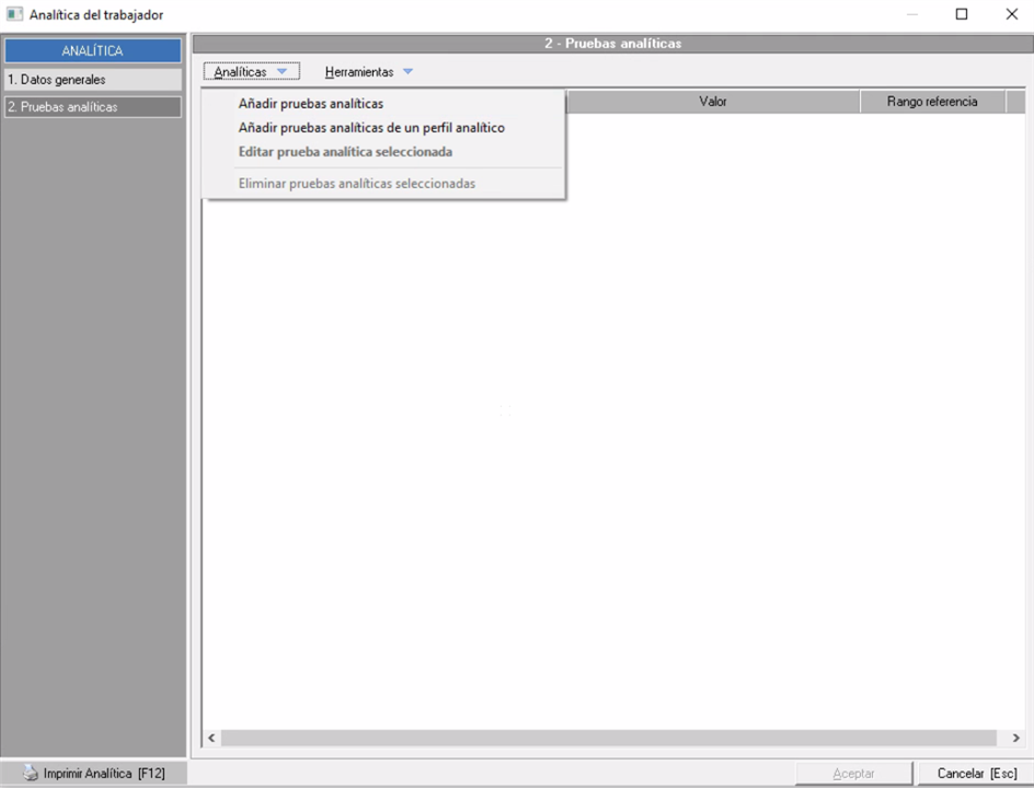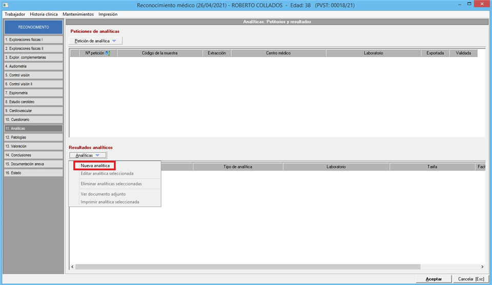 Para añadir las pruebas analíticas, con el menú superior dispone de dos opciones: