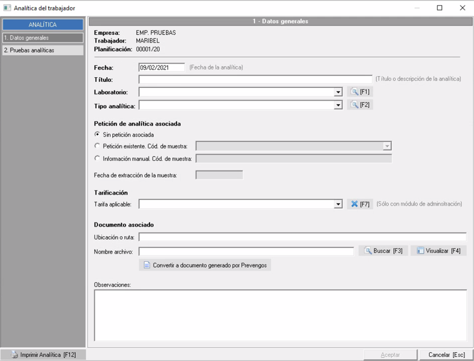 El petitorio de analíticas se utiliza para enviar un fichero al laboratorio indicándole que pruebas analíticas debe realizar al trabajador. Y en el apartado de analíticas, tal como indica su nombre, puede registrar las pruebas analíticas realizadas al trabajador. Las pruebas las puede crear manualmente, importar las analíticas con el importador o adjuntar un documento como analítica externa.