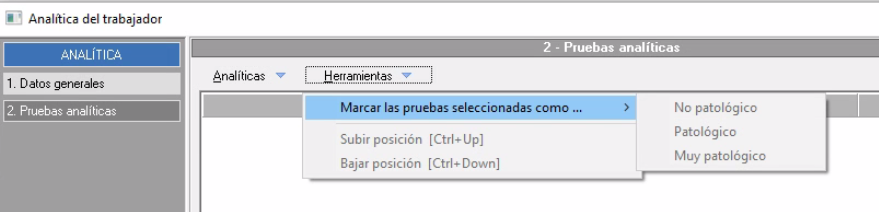 Desde el listado de pruebas analíticas, también dispone de herramientas masivas para marcar si son 'no patológicas', 'patológicas' o 'muy patológicas'. Recuerde que si ha utilizado el importador de analíticas es el laboratorio quien indica si una prueba es patalógica.