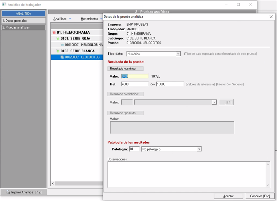 Una vez añadidas las pruebas, haciendo doble clic sobre cada una de ellas se muestran los datos de la prueba, donde puede indicar de forma manual el valor obtenido. Los valores que se indican en el campo ref. son los indicados en el mantenimiento de dicha prueba. Según el tipo de dato de la prueba se habilitará la opción correspondiente para indicar el resultado. Además dispone de un apartado para indicar si la prueba es o no patológica, tal y como se muestra en la siguiente imagen: