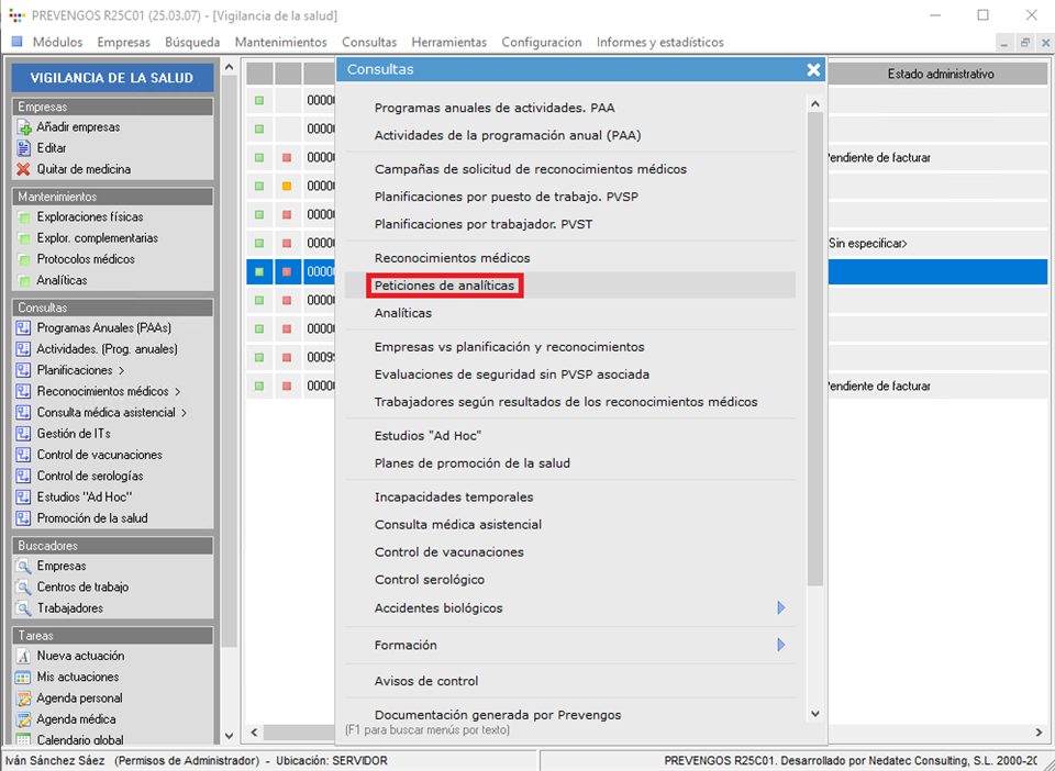 Dentro del reconocimiento médico de un trabajador el usuario puede registar petitorios de analíticas o registrar las propias analíticas. Estas opciones también las tienen disponibles en la consulta médica asistencial.