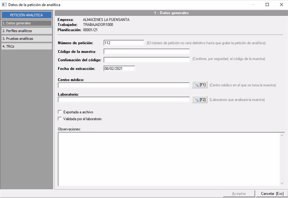 Al crear una nueva petición de analíticas, aparece una ficha donde tiene que completar al menos los datos marcados en negrita para poder grabar la petición.