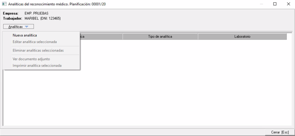 El reconocimiento médico de un trabajador dispone de un apartado de analíticas donde podrá registrar los resultados de las pruebas que se le realicen al trabajador.