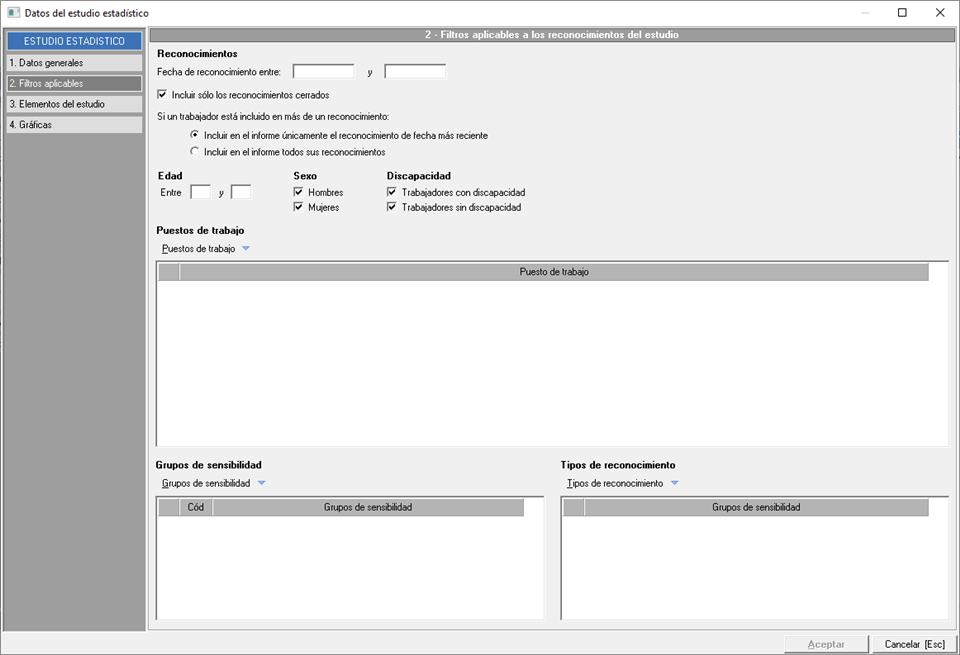 En esta pestaña están los filtros que puede aplicar, como puede ser el intervalo de fecha de reconocimientos a tener en cuenta para el estudio (pudiendo requerir que sólo cuenten los reconocimientos cerrados). Si incluir todos los reconocimientos o sólo los más recientes (en caso de que el trabajador tenga más de un reconocimiento dentro del periodo establecido para el estudio). Puede filtrar por un rango de edad, por hombre y mujeres o si presentan algun tipo de discapacidad.