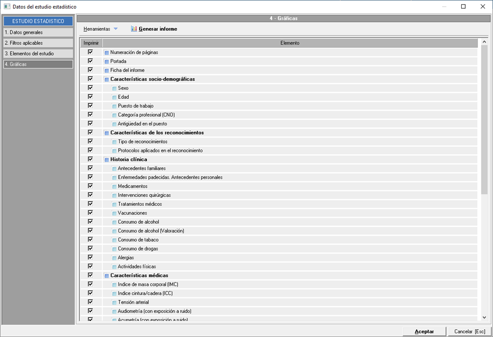 Aquí puede seleccionar todas las gráficas que desee incluir, según los filtros de las pestañas 2. Filtros aplicables y 3. Elementos del estudio marcándolas con la casilla correspondiente, para luego generar el informe utilizando el botón