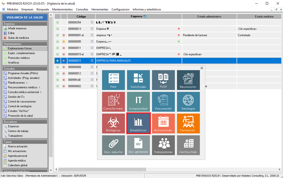 En ambos casos, la operación se lleva a cabo en la opción Estudios estadísticos de las acciones rápidas de la empresa en la pantalla principal del módulo de medicina o utilizando el menú superior delárea médica en la ficha de la empresa.