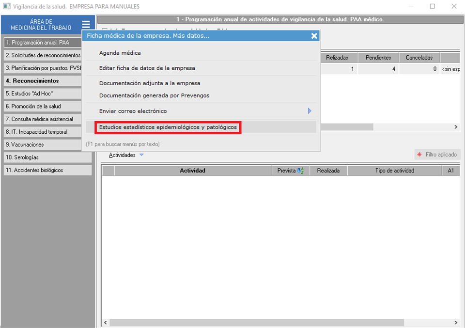 Este manual, examina los estudios estadísticos generados por Prevengos, que permite crear un estudio epidemiológico a partir de los reconocimientos, elaborando informes estadísticos con datos sobre sexo, edad, tipo, alergias, enfermedades, etc. Asimismo, puede realizar un estudio de las patologías más comunes en los reconocimientos, obteniendo informes estadísticos sobre exploraciones físicas, pruebas complementarias, protocolos y más.