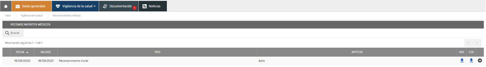 - Con el menú 'Vigilancia de la salud > Reconocimientos médicos' dará acceso al histórico de reconocimientos del trabajador.