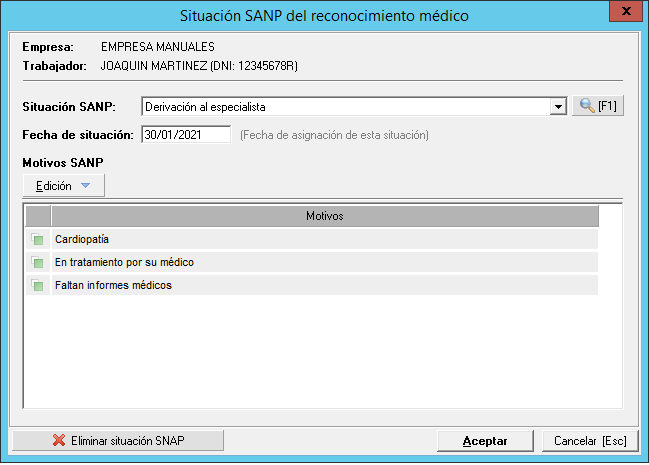 Puede darse el caso de que en algunos reconocimientos médicos se obtengan criterios de aptitud negativos que requieran que se registre información especial relacionada con el estado. Este apartado está destinado a registrar este tipo de información, es decir, si un trabajador ha obtenido en su reconocimiento una valoración negativa y el personal sanitario quiere añadir información adicional relacionada con el resultado del reconocimiento debe hacerlo en este punto.