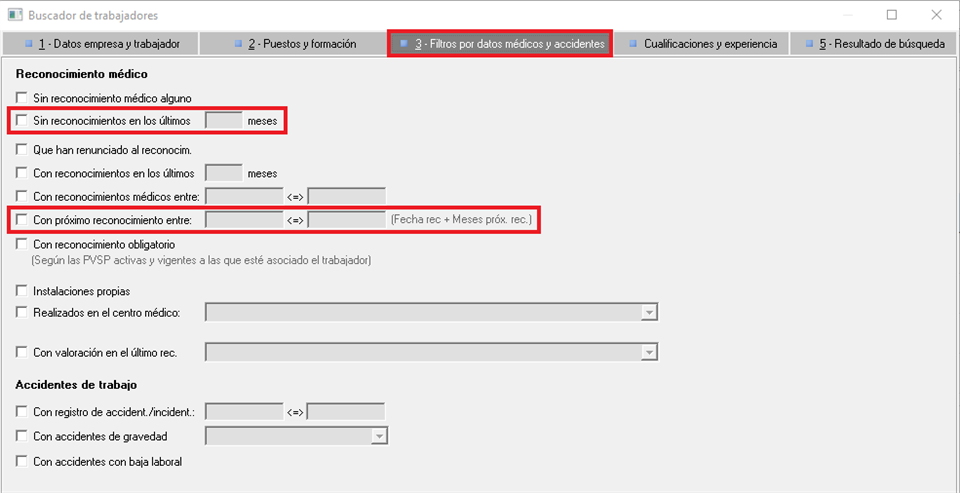 - Sin reconocimiento en los últimos ( ) meses. Este filtro es opcional, sería complementario al anterior y su uso puede ser útil, si se puede dar la circunstancia de que existan trabajadores a los que se les haya adelantado la realización del reconocimiento antes de la caducidad del anterior. Usandolo evitarán incluir en el aviso a trabajadores que entran en el filtro de fechas, pero que han renovado recientemente su reconocimiento.