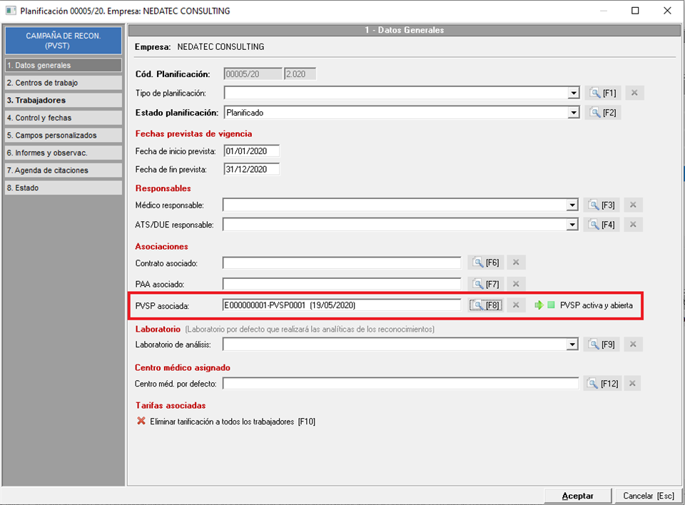 Si queremos actualizar los protocolos según las PVSP, será necesario crear al menos una PVSP en la empresa y relacionarla a la campaña de reconocimientos médicos correspondiente. Para ver más información sobre cómo crear y configurar una PVSP consultar el manual Planificaciones de Vigilancia de la Salud por puestos de trabajo. En la imagen que vemos a continuación, se muestra la ficha de datos generales de una PVST donde pueden observar el campo concreto en el que deben indicar la relación entre la campaña de reconocimientos y la PVSP.