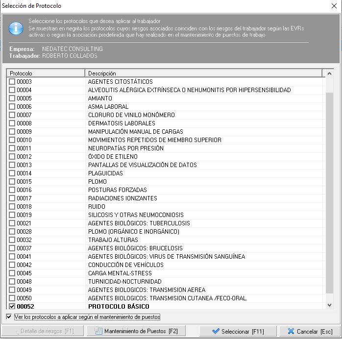 Como pueden apreciar en la parte inferior de la imagen, hay una opción que si la pulsan, les permite resaltar en negrita los protocolos que se le deberían aplicar a ese trabajador en función de su puesto de trabajo. Esta opción requiere que se haya realizado la relación de puestos de trabajo con protocolos tal como se explica en el documento Configuración de Protocolos Médicos.