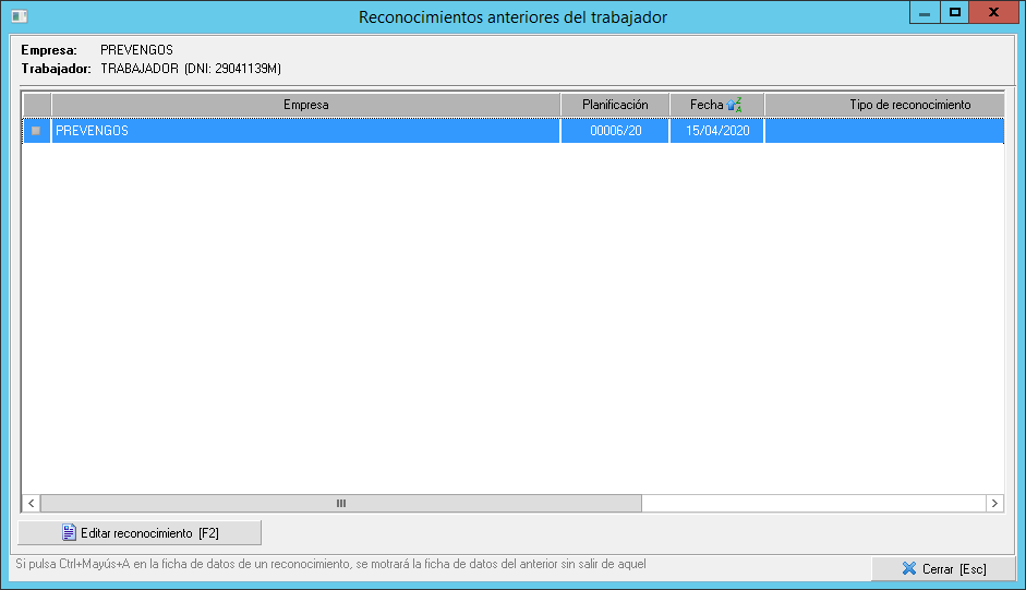Prevengos permite esta consulta de desde la ficha del reconocimiento actual usando el menú "Trabajador" o con situandose dentro del reconocimiento médico en cualquier pestaña y pulsando la combinación de teclado 'CTRL+A'. Con esta combinación de teclas abrirá la misma ventana en la que se encuentre, pero en el reconocimiento anterior de este trabajador.