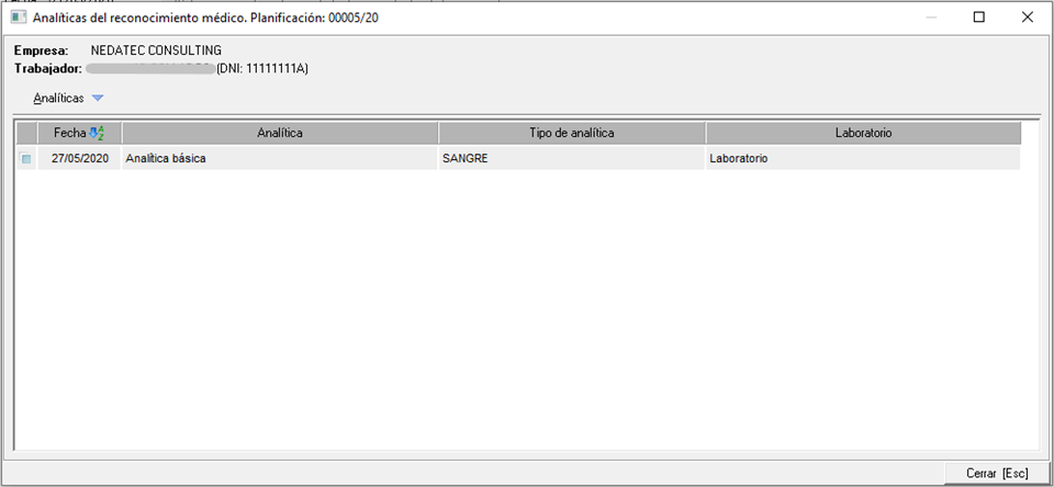 Al pulsar sobre esa opción accederemos al listado de analíticas relacionadas a ese reconocimiento médico.