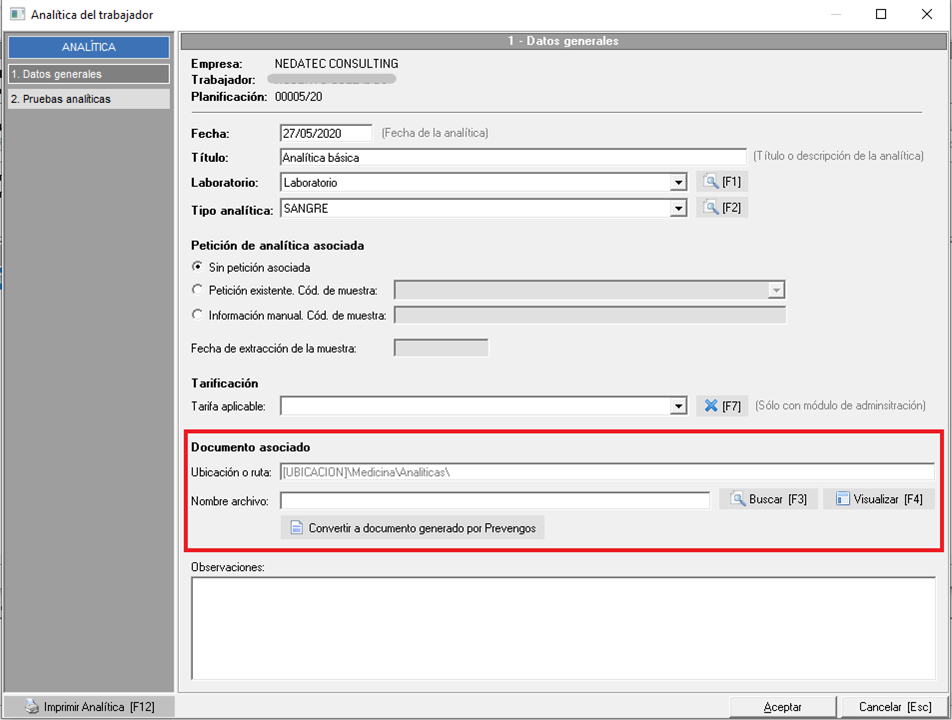 Una vez tiene el documento adjunto, si pincha en 'Convertir a documento generado por Prevengos' el documento será tratado como si hubiera sido generado por prevengos, por tanto, si pincha en 'Imprimir Analítica [F12]' (que pueden ver en la parte inferior izquierda de la ficha de la analítica) el buzón le mostrará el documento que usted ha adjuntado, no lo creará con las plantillas de impresión. Además si hace una consulta de documentación generada por prevengos, también podrá ver este documento.