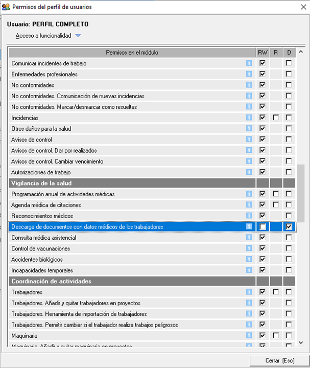 Para que Prevengos permita al usuario habilitar este check para la descarga de documentos médicos, el usuario tendrá que tener en RW el permiso "Habilitar el acceso a informes médicos en la web de empresa y centro" que se encuentra en el bloque de "Gestión general->Empresas" .