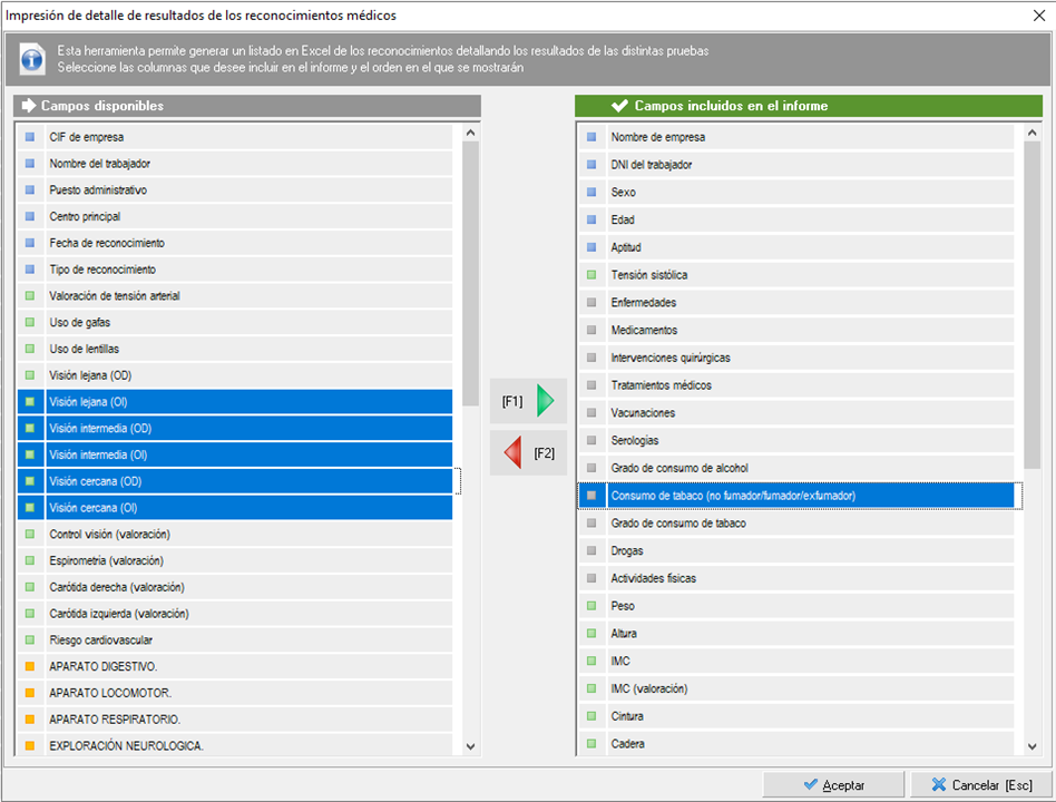 A saber, la flecha verde para incluir los elementos en el informe y la flecha roja para excluirlos del informe.