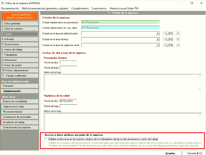 - Acceda a la ficha de datos de la empresa y pulse sobre la pestaña "Vigilancia de la salud".