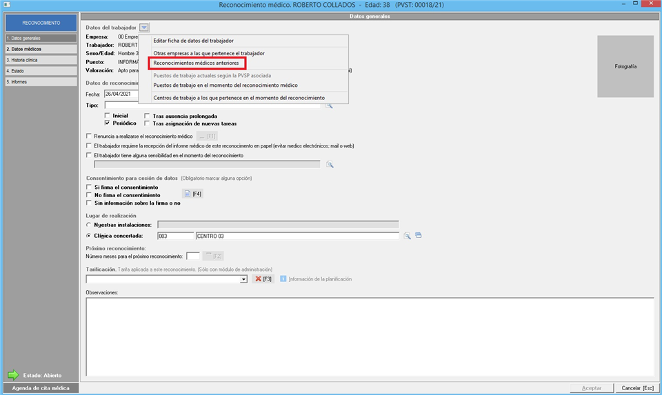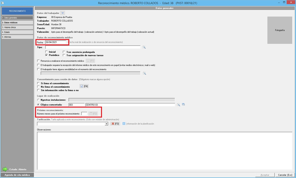 Finalizado el proceso tendrá que acceder a la ficha del reconocimiento médico para indicar la fecha de realización, ya que este dato no se copia.