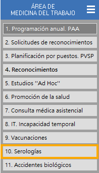 Prevengos dispone de un apartado específico para registrar las serologías realizadas a los trabajadores. Estos registros quedan integrados en la historia clínico-laboral del trabajador, incorporándose automáticamente cuando se crea un nuevo reconocimiento médico o una consulta médica.