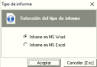 Para imprimir un informe con el listado actual en pantalla ya sea en Word o Excel debe de ir al menú "Informes->Imprimir listado actual" que nos abrirá un pequeño formulario para seleccionar el formato en el que queremos nuestro informe.