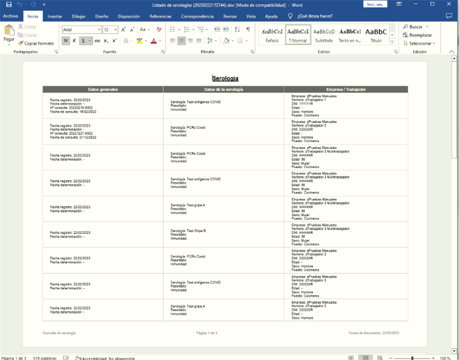 El informe tipo Word sw mostrará como en el ejemplo siguiente: