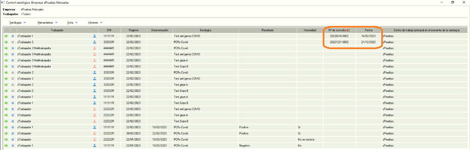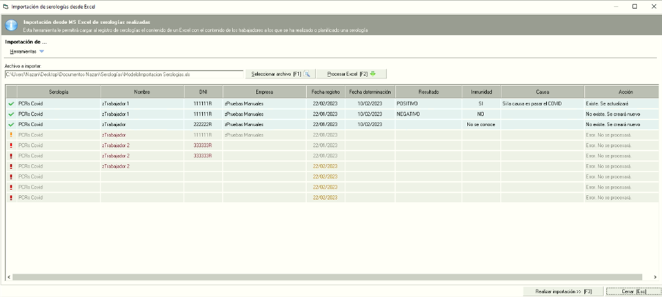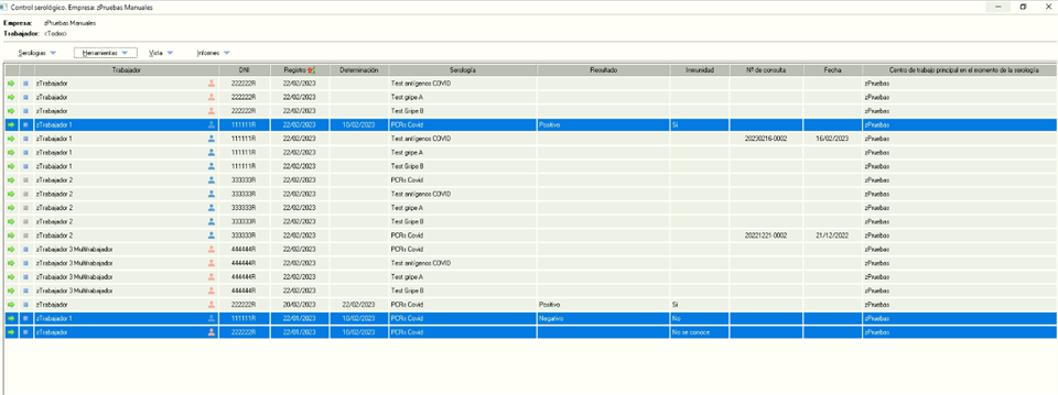 , puede indicar que la serología no existe, que no existe ni el nombre del trabajador ni el DNI . Se marca en rojo el campo que no existe. También puede indicar que el trabajador esté desactivado.