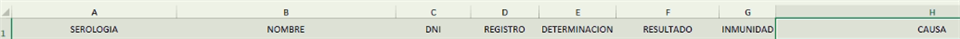 Al abrir el importador, desde de un menú superior 'Herramientas->obtener una copia de la plantilla de Excel de importación' podrá descargar la plantilla de excel que necesita a la carpeta que seleccione de su equipo y cumplimentarlo para poder cargar las serologías en Prevengos, que tendrá las siguientes columnas: