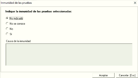 La siguiente herramienta está pensada para asignar de forma masiva al listado seleccionado la inmunidad correspondiente. Para ello, seleccionamos el registro de serologías que se les quiera cumplimentar este dato y pinchando en "Herramientas->Indicar inmunidad" se nos abrirá una ventana, como la que vemos en la imágen, para que seleccionemos si: