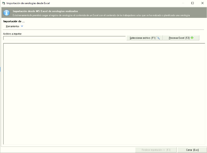Prevengos dispone de un importador para cargar serologías mediante un excel. Accederemos al importador desde el menú "Herramientas->Importar registros de serologías desde Excel"