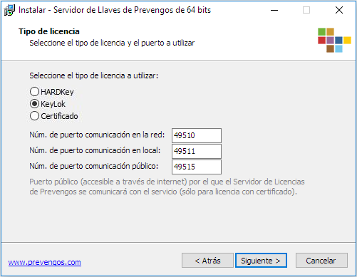 - IP pública estática y puerto TCP 49515 accesible desde el servidor de licencias de Prevengos (SLP).