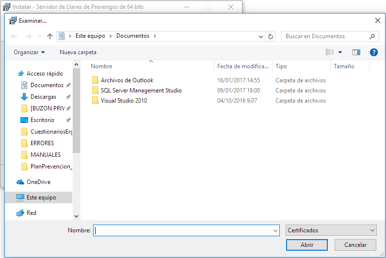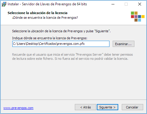 Esta pantalla sólo se mostrará si ha indicado el licenciamiento por certificado y tendrá que usar el botón Examinar... para seleccionar el fichero de la ruta donde se ubica, como se ha indicado al inicio de este apartado.