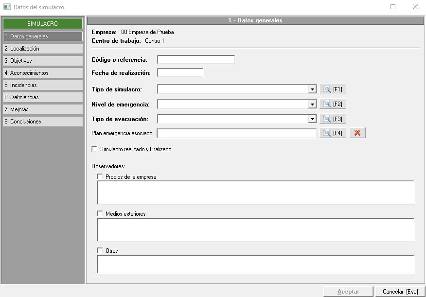 Por último, disponemos de los campos de texto libre donde indicaremos, en caso de existir, los observadores propios de la empresa, medios exteriores u otros que van a estar presentes durante la realización del simulacro.