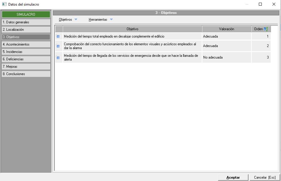 Dentro de ésta debemos de añadir todos aquellos objetivos para la celebración del simulacro, para ello usaremos el desplegable "Objetivos" donde encontraremos las opciones necesarias para añadir, editar o eliminar elementos. Al usar la opción de "Nuevo objetivo" se nos muestra une ventana donde debemos de poner el objetivo en sí, pudiendo valorarlo mediante un desplegable situado en la parte inferior de la misma ventana.