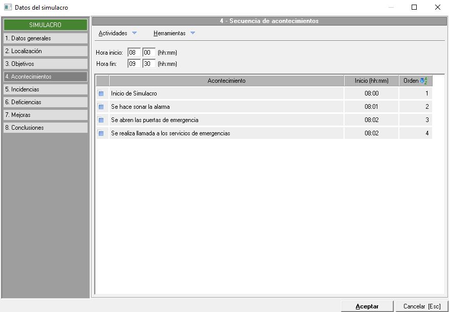 Dentro de esta pestaña indicaremos información sobre las actividades o acontecimientos que se van a dar a lo largo del simulacro, de manera similar a la siguiente imagen: