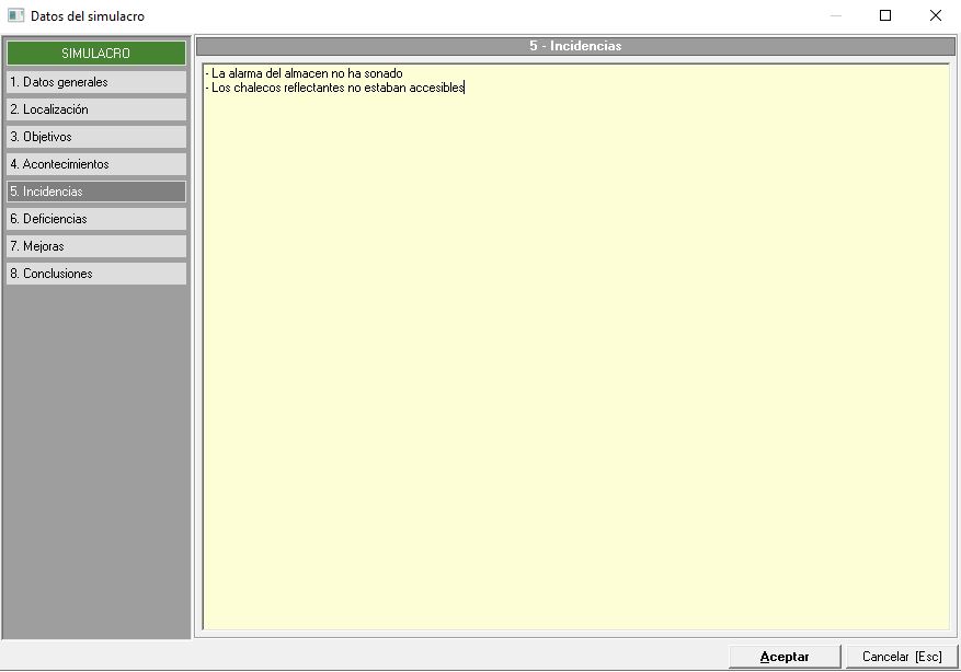 En esta pestaña disponemos de un campo de texto libre donde el técnico puede especificar todas aquellas incidencias detectadas durante la realización del simulacro, en una pantalla similar a la siguiente imagen: