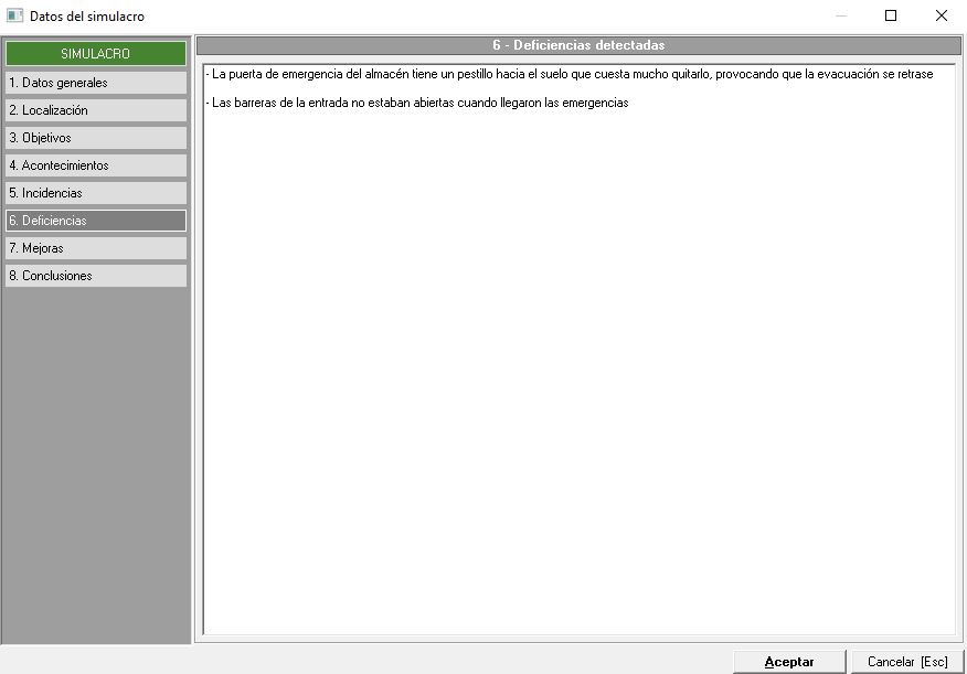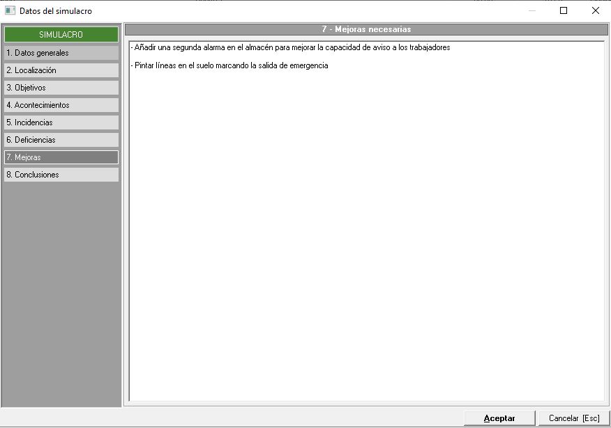 Igual que en las pestañas anteriores, disponemos de un campo de texto libre para que, en este caso, el técnico indique mejoras a implantar para mejorar algún proceso del simulacro y conseguir con ello, mejor efectividad. La ventana es similar a la siguiente imagen:
