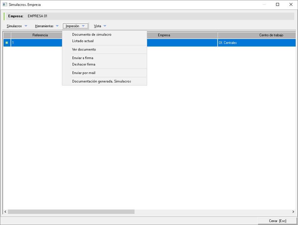 Si accedemos desde este último punto veremos la pantalla principal de los simulacros donde se mostrarán aquellos existentes en la empresa, tal y como podemos ver en la siguiente imagen: