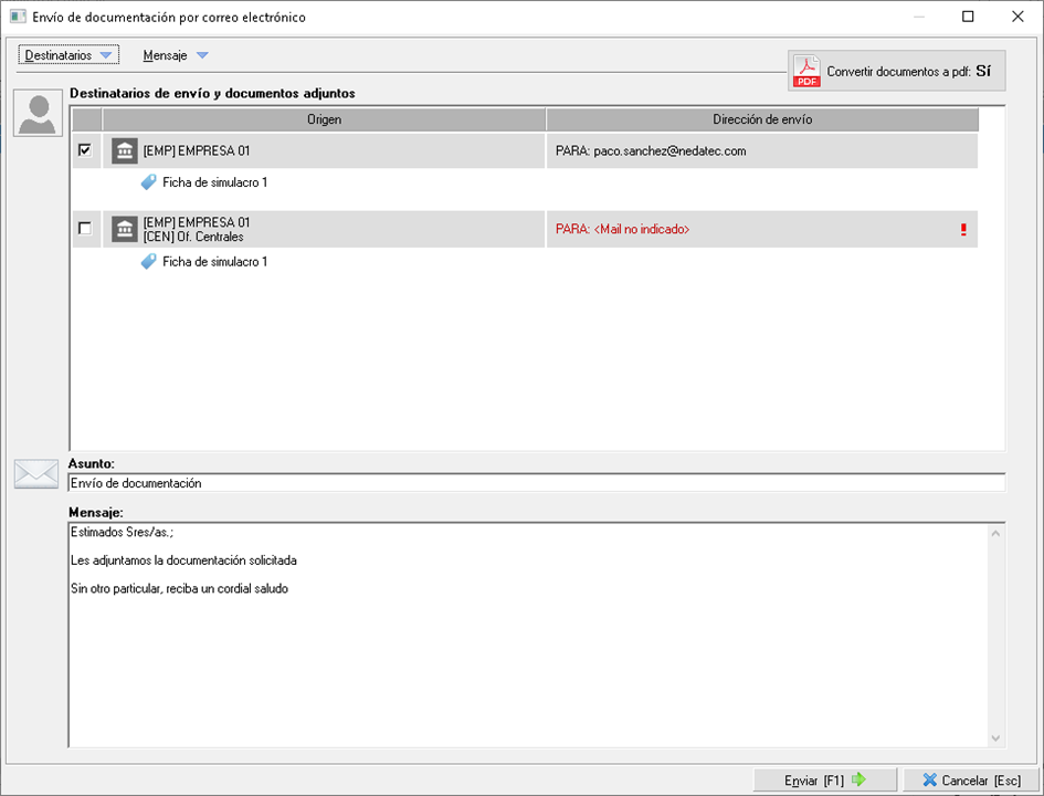 En éste podrá editar los destinatarios por defecto, añadir más destinatarios, configurar la conversión a PDF del documento Word, editar el mensaje...