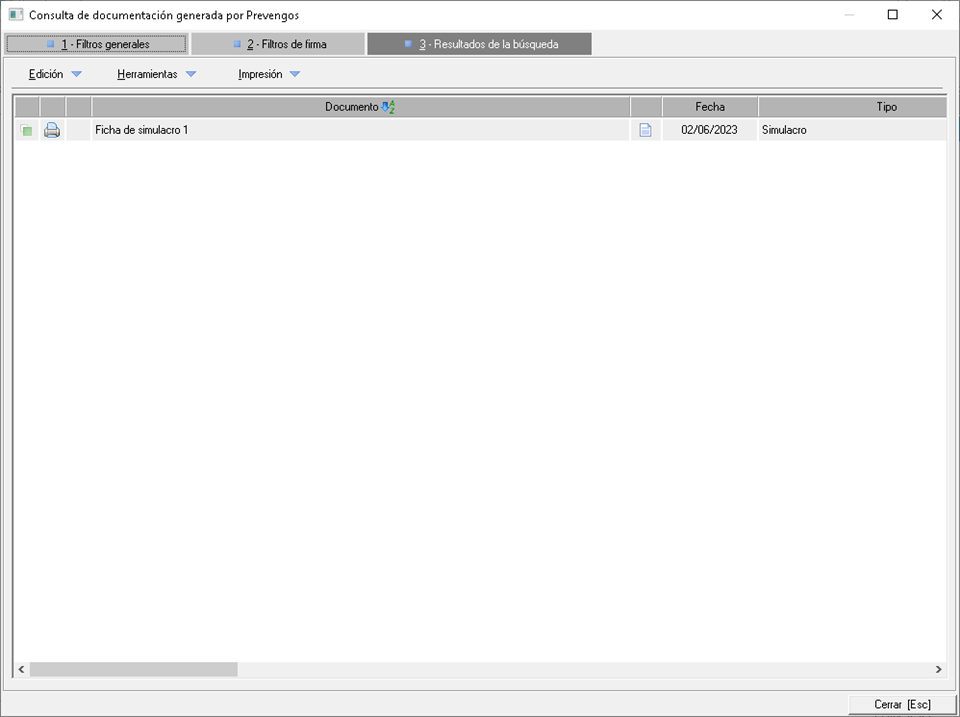 Permite la visualización del documento generado del simulacro.