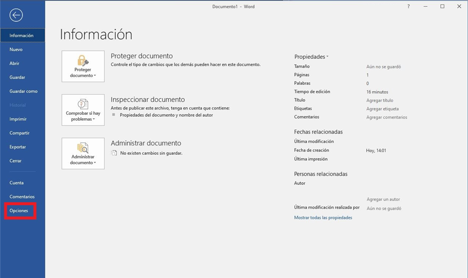 Antes de realizar la configuración, debemos de cerrar todos los programas del paquete Office. Para ello cerraremos Word, Excel, PowerPoint,... que tengamos abiertos (Outlook no es necesario). Estando todo cerrado procedemos a abrir Word con un documento nuevo, evitar abrir un documento ya existente. Teniendo el documento en blanco en pantalla, accederemos a las opciones mediante el botón Archivo situado en la parte superior izquierda, y seleccionaremos el botón Opciones tal y como se muestra en la siguiente imagen: