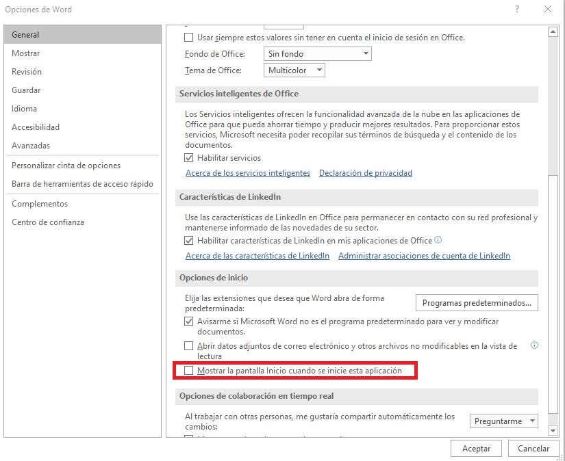 Dentro de las Opciones de Word, en la pestaña General, debemos DESHABILITAR la opción Mostrar la pantalla Inicio cuando se inicie la aplicación. Para que lo podamos ver más claro, simplemente debemos de seguir la siguiente captura: