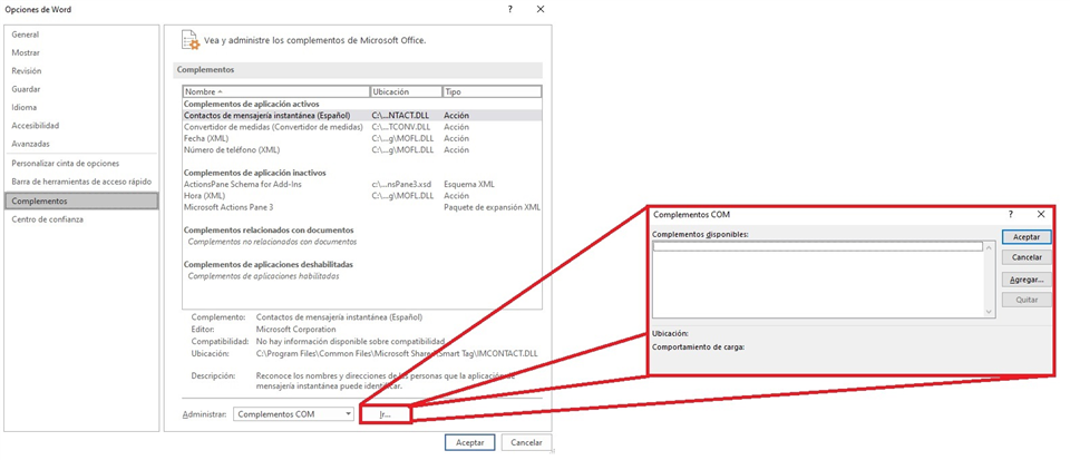 Una vez eliminados/deshabilitados los complementos de Word pulse [Aceptar].