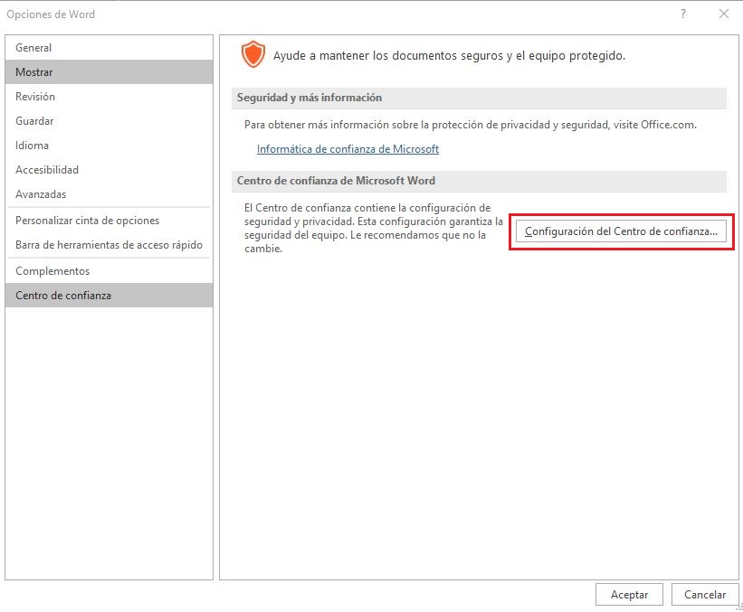 Una de las opciones de seguridad que tiene Office es el "Centro de confianza", dentro de esta herramienta vamos a configurar diferentes apartados, por lo que primero deberemos acceder a la misma dentro de las pestaña "Centro de confianza" de las opciones de Word, mediante el botón "Configuración del centro de confianza...." tal y como vemos en la siguiente imagen: