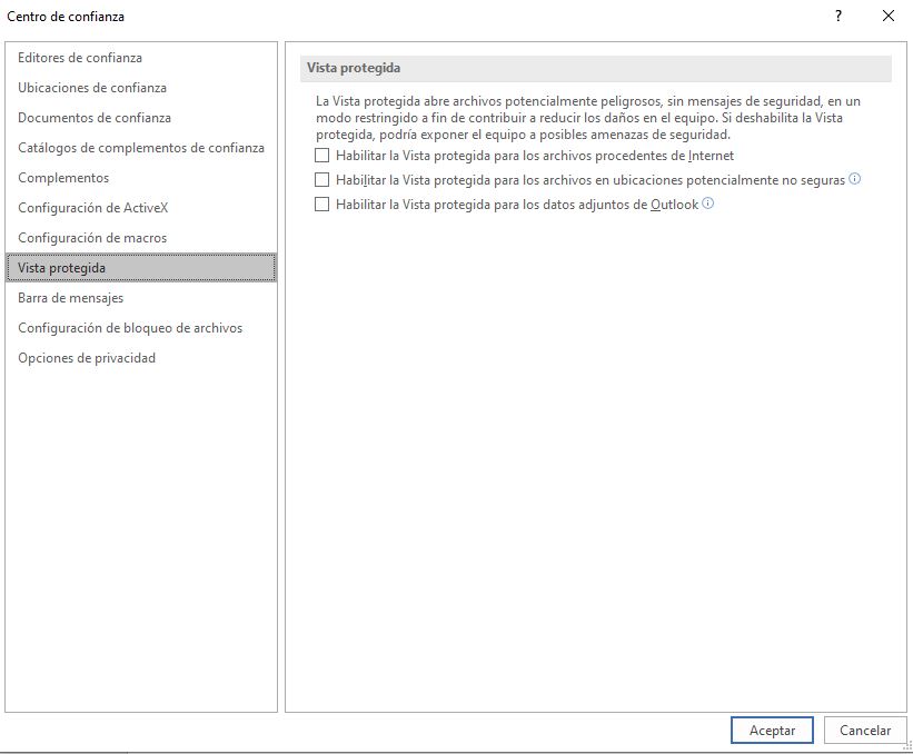 Una vez tengamos la vista protegida y las macros deshabilitados, sin cerrar la ventana, accederemos a las siguientes pestañas y marcaremos (habilitaremos) las siguientes opciones: